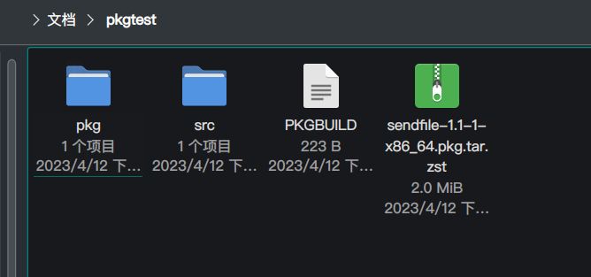 最后makepkg完成打包。最后会在当前目录生成一个zst文件,就是pacman的安装文件,使用```